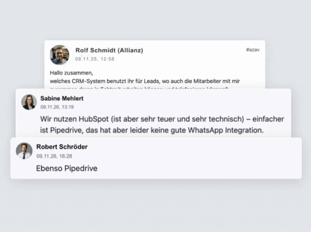 | Neues Tool evaluieren | Tage mit Recherche, Tests und Unsicherheit verbringen – ohne Garantie, dass es passt | Im Feed fragen: "Wer nutzt das?" → Echte Erfahrungen von Kollegen |